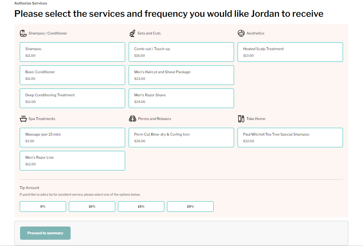 By creating an online profile in the PS Celebration Portal you are able to authorize salon services, choose their frequency, add a tip, and the fund the account to pay for those services.